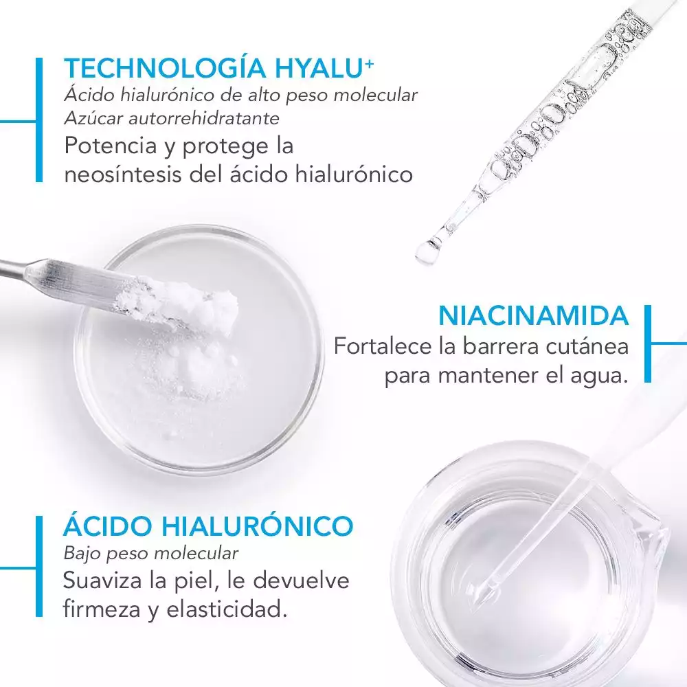 Componentes: El ácido hialurónico es conocido por su capacidad para retener la humedad, mientras que la vitamina B3 mejora la barrera cutánea y la textura de la piel.