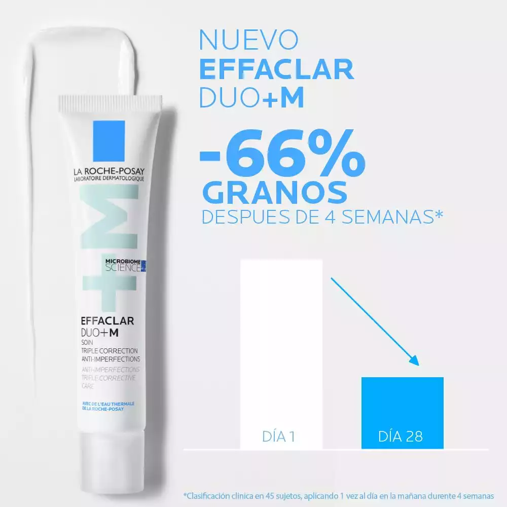 Effaclar Duo+M Tratamiento Anti-Imperfecciones es un serum corrector triple anti-imperfecciones diseñado para pieles grasas y con tendencia acneica. Este producto combina Phylobioma, Procerad y Niacinamida para reducir la sobreproducción de sebo, calmar y corregir las imperfecciones, y difuminar la apariencia de las manchas oscuras y la pigmentación. Proporciona una piel más limpia y uniforme, reduciendo visiblemente las imperfecciones en solo 8 horas y previniendo su reaparición.