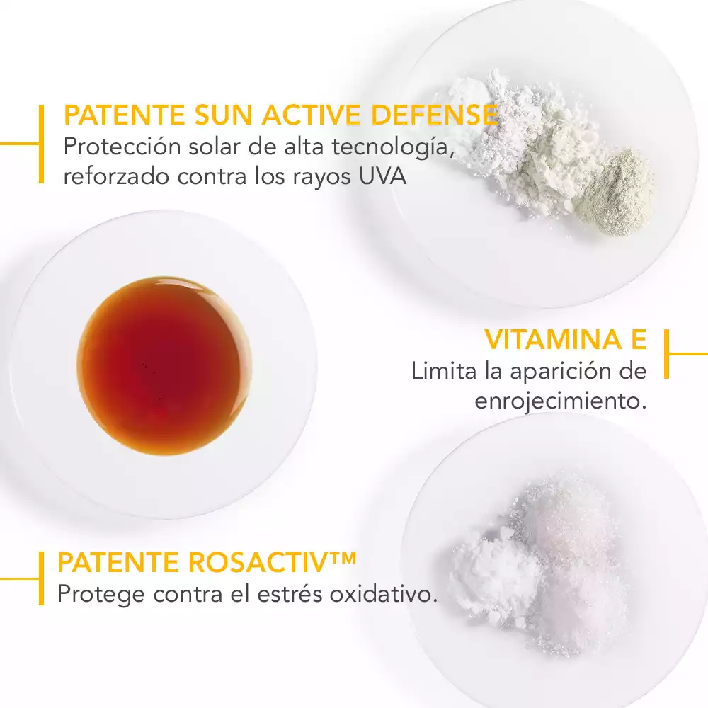 Ofrece una protección anti-rojeces UVA/UVB muy alta frente a los efectos nocivos de los rayos UV (quemaduras solares, alergias solares, etc.)
