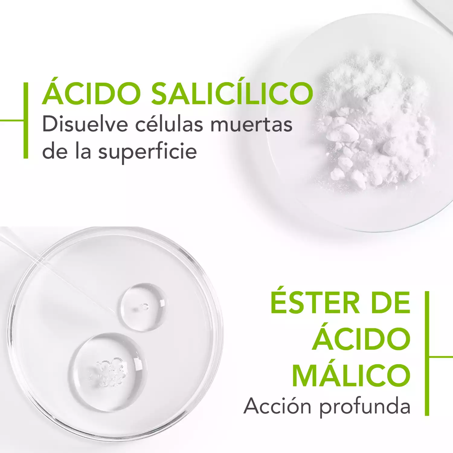 Complejo queratolítico: Ácido salicílico (BHA) 1,8 % + éster de ácido málico (nueva generación de AHA) 10%.