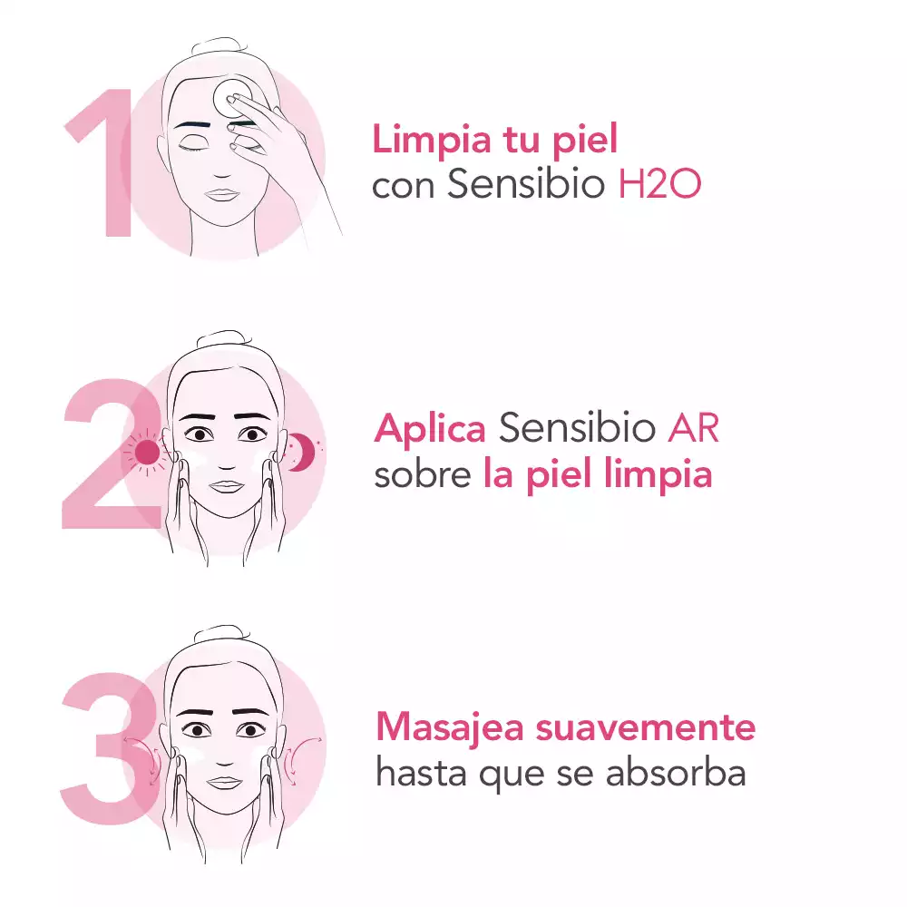 Aplicar sobre la piel sana. Este producto no es medicamento. Pídele consejo a tu dermatólogo o farmacéutico. En caso de sobrecalentamiento intenso, Sensibio AR Cuidado Anti-Rojeces se puede combinar ocasionalmente con un tratamiento calmante de acción rápida. Durante los períodos soleados, recomendamos usar fotoprotección adaptada a la piel sensible y reactiva: un tratamiento de fotoprotección calmante y anti-rojeces.