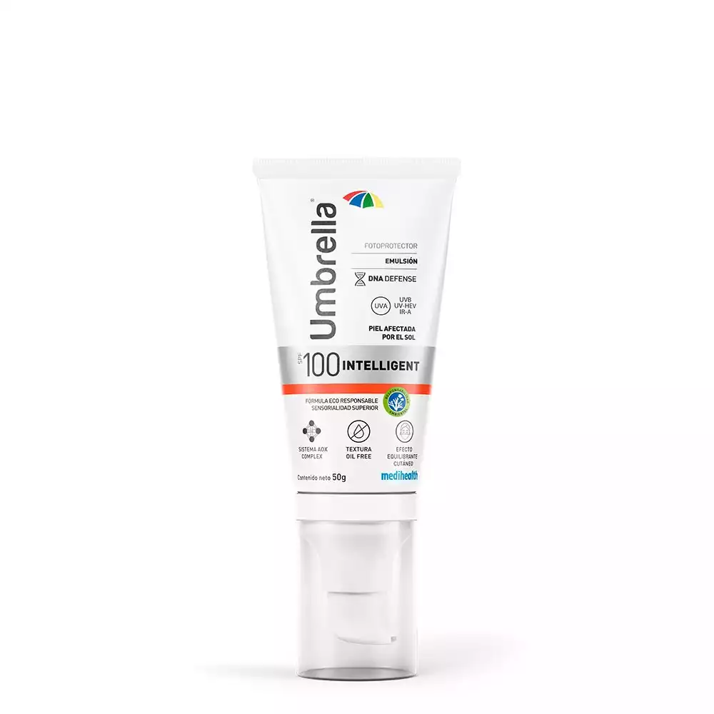 Umbrella Intelligent SPF 100 es un protector solar de última generación, altamente especializado, que protege la piel de la radiación solar UV-B, UV-A y de los efectos nocivos de la radiación UV-Visible de alta energía (UV-HEV) e infrarrojo cercano (IR-A), gracias a su exclusiva combinación de ingredientes. Umbrella Intelligent ofrece un sistema integral de cuidado dermatológico que potencia los mecanismos de prevención, protección, reparación y reestructuración de la piel frente a los daños causados por la radiación solar, combinando los avances de la nanotecnología, biotecnología y la liberación inteligente de moléculas dermatológicamente activas.